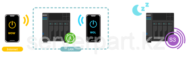 Поддержка системного спящего режима (S3) и сетевых устройств хранения данных Wake on Wan. Технология Wake on Wan компании ASUSTOR выводит сетевое хранилище из спящего режима за 1,5 секунды, устраняя необходимость ждать утомительного процесса загрузки и пробуждая NAS удаленно, когда вам это необходимо, полностью блокируя возможность атаки и обеспечивая безопасность ваших данных.